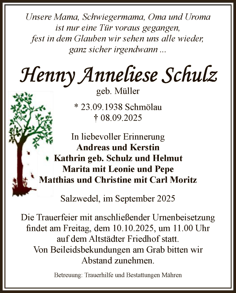 Hier finden Sie alle Traueranzeigen aus der Zeitung, die bisher für Henny Anneliese Schulz erschienen sind. Weitere Traueranzeigen, die in der Zeitung erscheinen, werden hier ebenfalls aufgelistet
