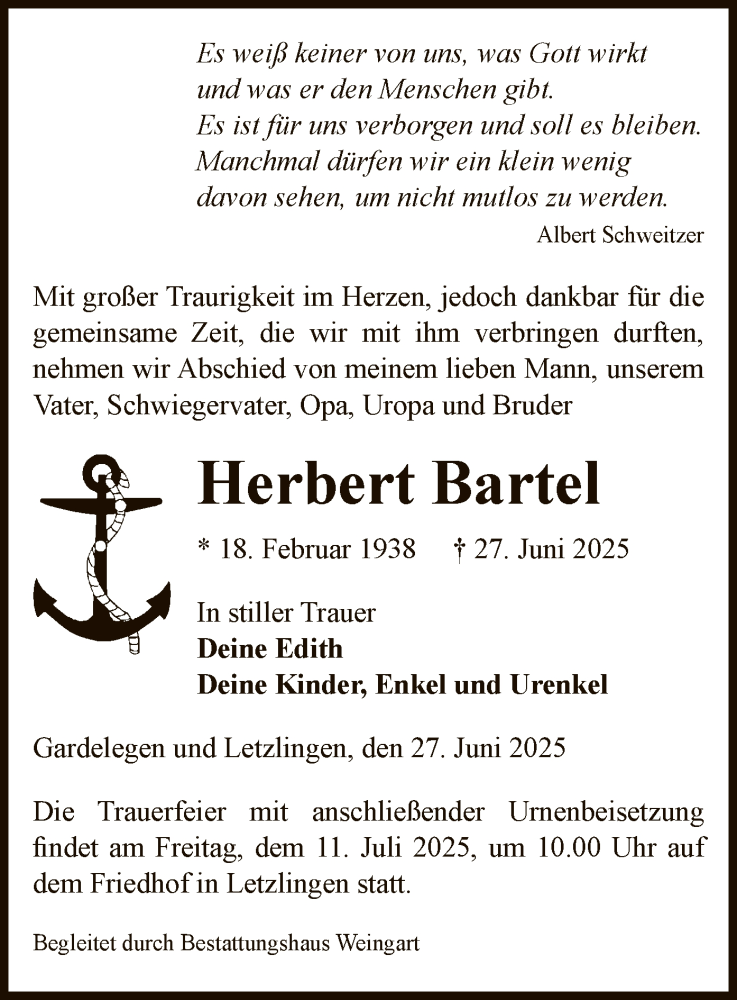 Hier finden Sie alle Traueranzeigen aus der Zeitung, die bisher für Herbert Bartel erschienen sind. Weitere Traueranzeigen, die in der Zeitung erscheinen, werden hier ebenfalls aufgelistet