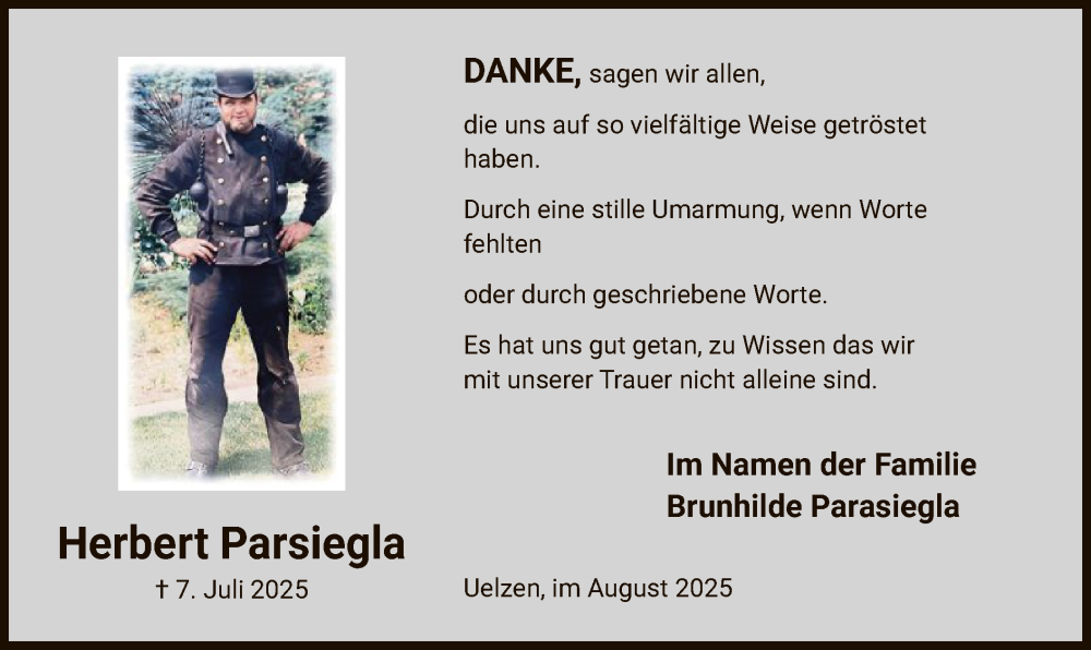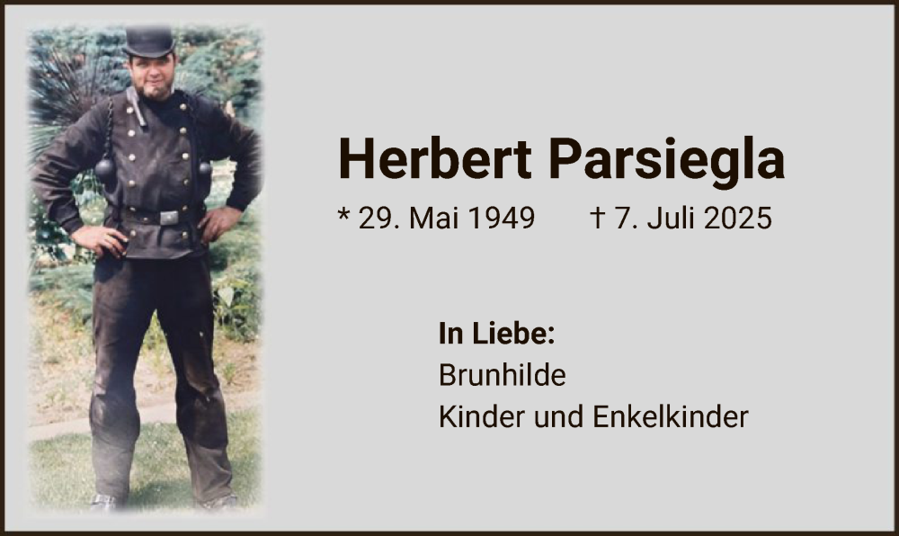 Hier finden Sie alle Traueranzeigen aus der Zeitung, die bisher für Herbert Parsiegla erschienen sind. Weitere Traueranzeigen, die in der Zeitung erscheinen, werden hier ebenfalls aufgelistet