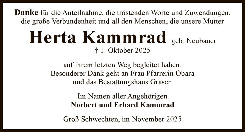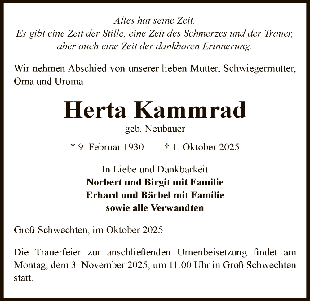 Hier finden Sie alle Traueranzeigen aus der Zeitung, die bisher für Herta Kammrad erschienen sind. Weitere Traueranzeigen, die in der Zeitung erscheinen, werden hier ebenfalls aufgelistet
