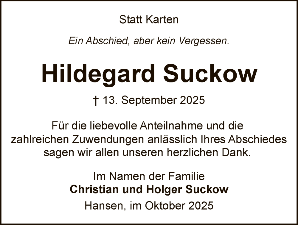 Hier finden Sie alle Traueranzeigen aus der Zeitung, die bisher für Hildegard Suckow erschienen sind. Weitere Traueranzeigen, die in der Zeitung erscheinen, werden hier ebenfalls aufgelistet
