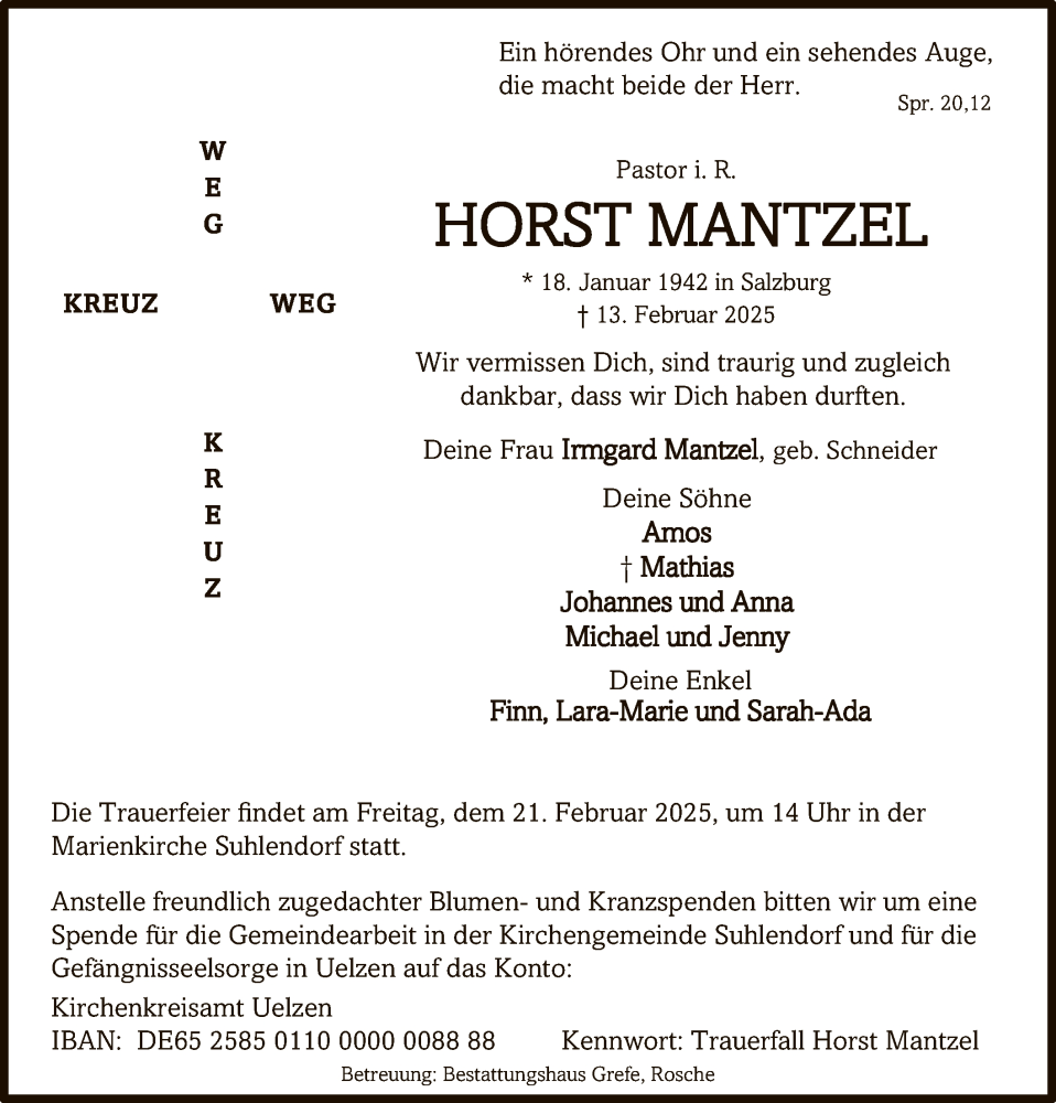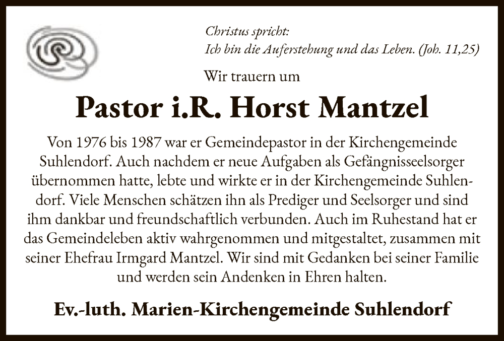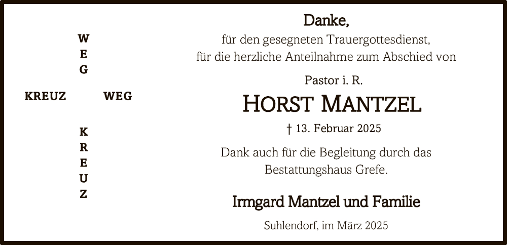 Hier finden Sie alle Traueranzeigen aus der Zeitung, die bisher für Horst Mantzel erschienen sind. Weitere Traueranzeigen, die in der Zeitung erscheinen, werden hier ebenfalls aufgelistet