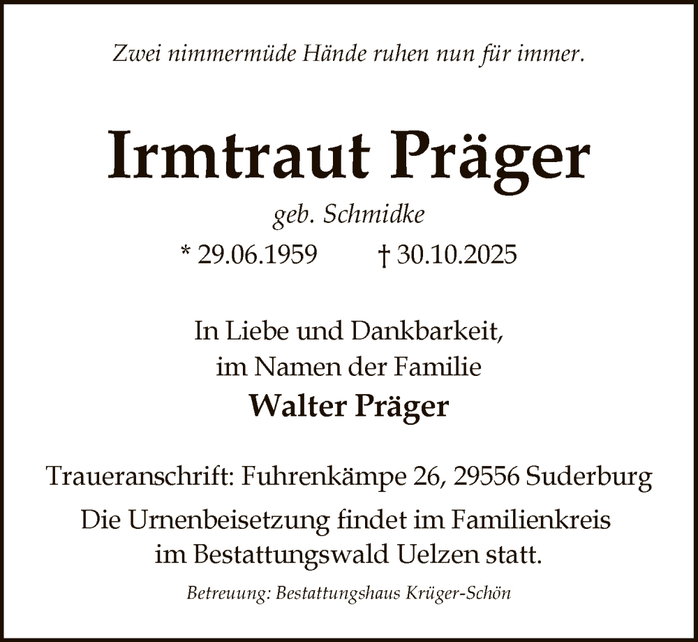 Hier finden Sie alle Traueranzeigen aus der Zeitung, die bisher für Irmtraut Präger erschienen sind. Weitere Traueranzeigen, die in der Zeitung erscheinen, werden hier ebenfalls aufgelistet