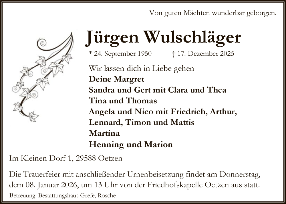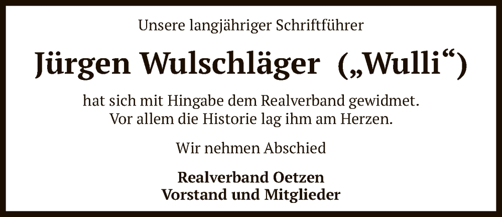 Hier finden Sie alle Traueranzeigen aus der Zeitung, die bisher für Jürgen Wulschläger erschienen sind. Weitere Traueranzeigen, die in der Zeitung erscheinen, werden hier ebenfalls aufgelistet