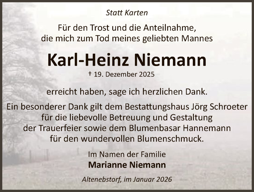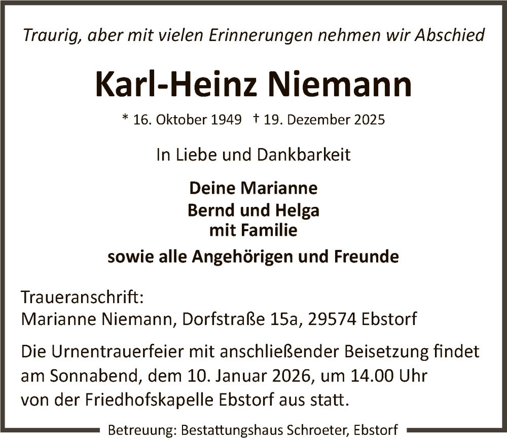 Hier finden Sie alle Traueranzeigen aus der Zeitung, die bisher für Karl-Heinz Niemann erschienen sind. Weitere Traueranzeigen, die in der Zeitung erscheinen, werden hier ebenfalls aufgelistet