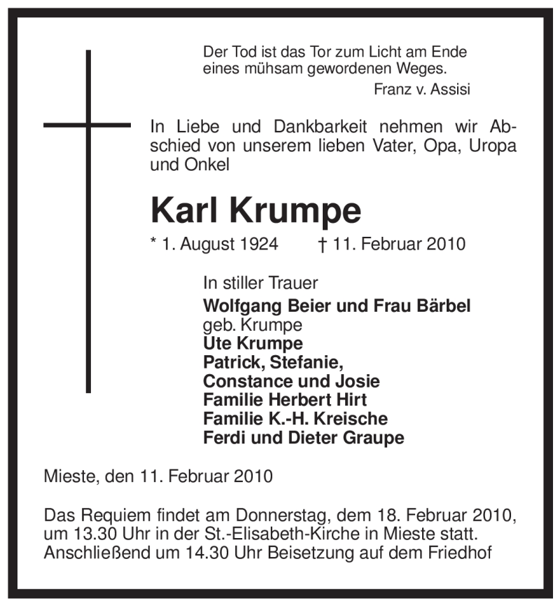 Hier finden Sie alle Traueranzeigen aus der Zeitung, die bisher für Karl Krumpe erschienen sind. Weitere Traueranzeigen, die in der Zeitung erscheinen, werden hier ebenfalls aufgelistet