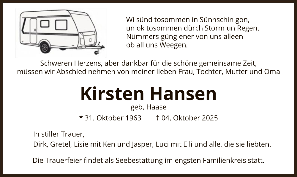 Hier finden Sie alle Traueranzeigen aus der Zeitung, die bisher für Kirsten Hansen erschienen sind. Weitere Traueranzeigen, die in der Zeitung erscheinen, werden hier ebenfalls aufgelistet