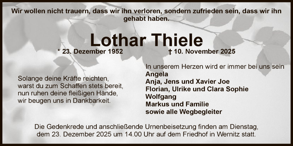 Hier finden Sie alle Traueranzeigen aus der Zeitung, die bisher für Lothar Thiele erschienen sind. Weitere Traueranzeigen, die in der Zeitung erscheinen, werden hier ebenfalls aufgelistet