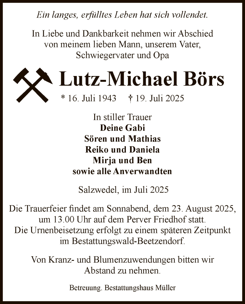 Hier finden Sie alle Traueranzeigen aus der Zeitung, die bisher für Lutz-Michael Börs erschienen sind. Weitere Traueranzeigen, die in der Zeitung erscheinen, werden hier ebenfalls aufgelistet
