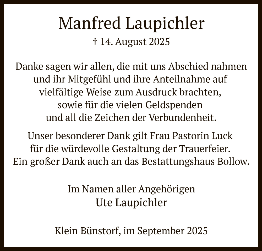 Hier finden Sie alle Traueranzeigen aus der Zeitung, die bisher für Manfred Laupichler erschienen sind. Weitere Traueranzeigen, die in der Zeitung erscheinen, werden hier ebenfalls aufgelistet