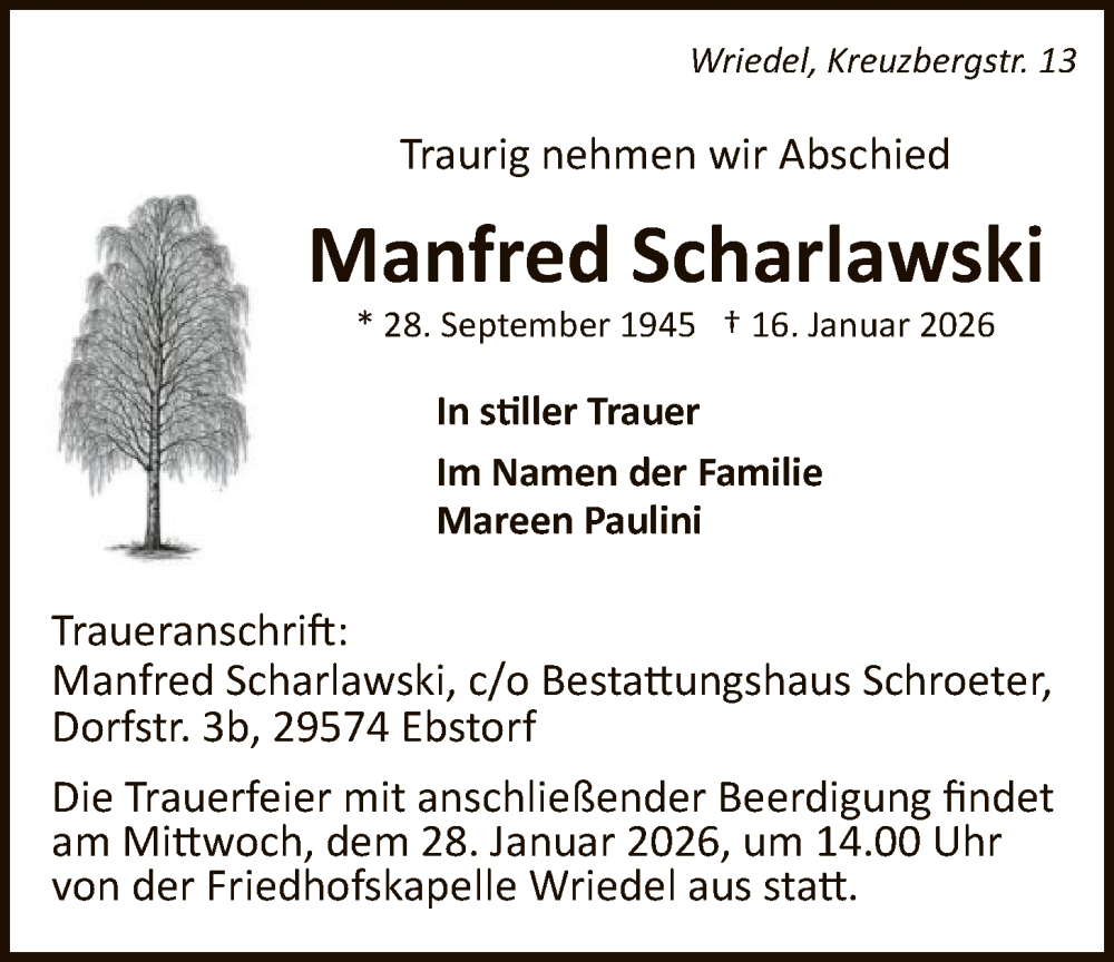 Hier finden Sie alle Traueranzeigen aus der Zeitung, die bisher für Manfred Scharlawski erschienen sind. Weitere Traueranzeigen, die in der Zeitung erscheinen, werden hier ebenfalls aufgelistet