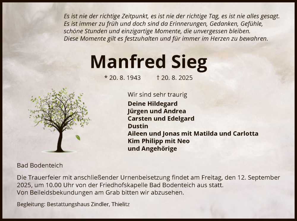 Hier finden Sie alle Traueranzeigen aus der Zeitung, die bisher für Manfred Sieg erschienen sind. Weitere Traueranzeigen, die in der Zeitung erscheinen, werden hier ebenfalls aufgelistet