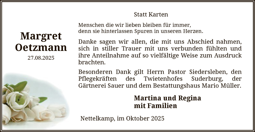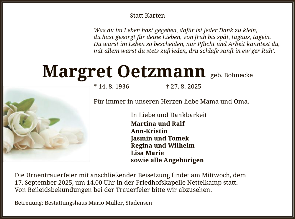 Hier finden Sie alle Traueranzeigen aus der Zeitung, die bisher für Margret Oetzmann erschienen sind. Weitere Traueranzeigen, die in der Zeitung erscheinen, werden hier ebenfalls aufgelistet