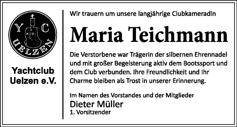 Hier finden Sie alle Traueranzeigen aus der Zeitung, die bisher für Maria Teichmann erschienen sind. Weitere Traueranzeigen, die in der Zeitung erscheinen, werden hier ebenfalls aufgelistet