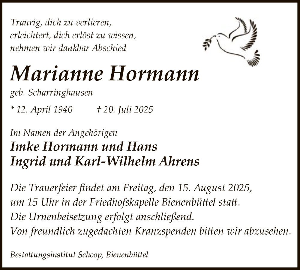 Hier finden Sie alle Traueranzeigen aus der Zeitung, die bisher für Marianne Hormann erschienen sind. Weitere Traueranzeigen, die in der Zeitung erscheinen, werden hier ebenfalls aufgelistet