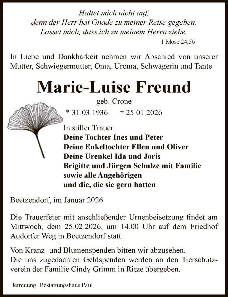 Hier finden Sie alle Traueranzeigen aus der Zeitung, die bisher für Marie-Luise Freund erschienen sind. Weitere Traueranzeigen, die in der Zeitung erscheinen, werden hier ebenfalls aufgelistet