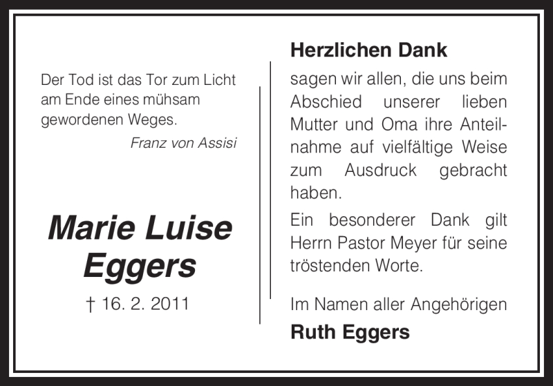 Hier finden Sie alle Traueranzeigen aus der Zeitung, die bisher für Marie Luise Eggers erschienen sind. Weitere Traueranzeigen, die in der Zeitung erscheinen, werden hier ebenfalls aufgelistet