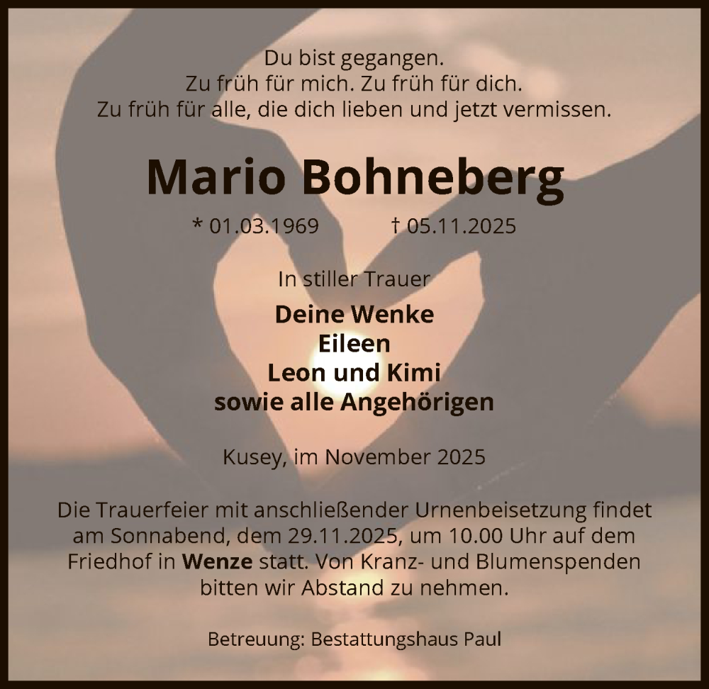 Hier finden Sie alle Traueranzeigen aus der Zeitung, die bisher für Mario Bohneberg erschienen sind. Weitere Traueranzeigen, die in der Zeitung erscheinen, werden hier ebenfalls aufgelistet
