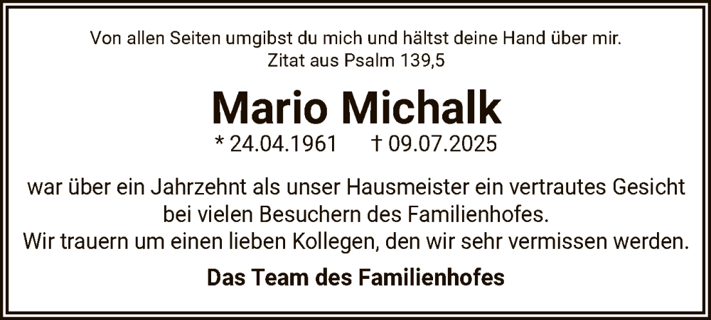 Hier finden Sie alle Traueranzeigen aus der Zeitung, die bisher für Mario Michalk erschienen sind. Weitere Traueranzeigen, die in der Zeitung erscheinen, werden hier ebenfalls aufgelistet