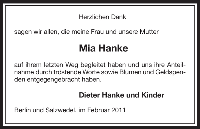 Hier finden Sie alle Traueranzeigen aus der Zeitung, die bisher für Mia Hanke erschienen sind. Weitere Traueranzeigen, die in der Zeitung erscheinen, werden hier ebenfalls aufgelistet
