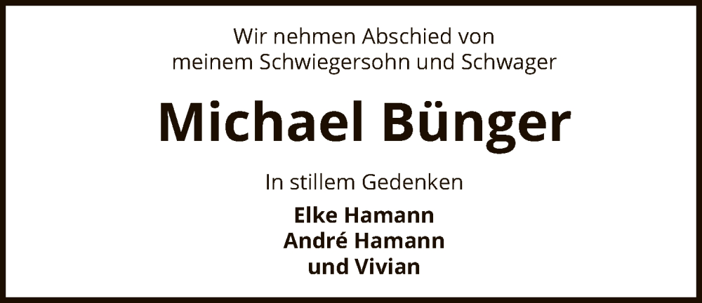 Hier finden Sie alle Traueranzeigen aus der Zeitung, die bisher für Michael Bünger erschienen sind. Weitere Traueranzeigen, die in der Zeitung erscheinen, werden hier ebenfalls aufgelistet