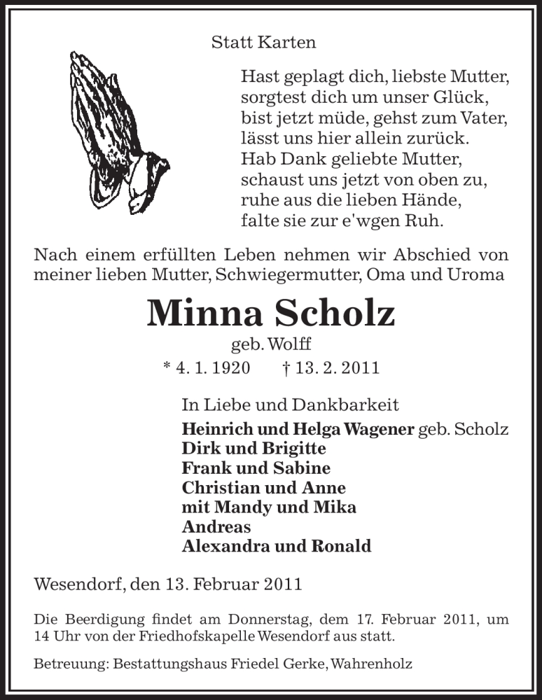 Hier finden Sie alle Traueranzeigen aus der Zeitung, die bisher für Minna Scholz erschienen sind. Weitere Traueranzeigen, die in der Zeitung erscheinen, werden hier ebenfalls aufgelistet