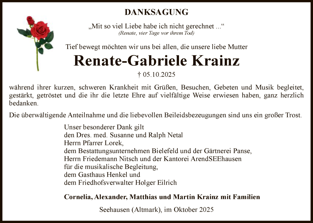 Hier finden Sie alle Traueranzeigen aus der Zeitung, die bisher für Renate-Gabriele Krainz erschienen sind. Weitere Traueranzeigen, die in der Zeitung erscheinen, werden hier ebenfalls aufgelistet