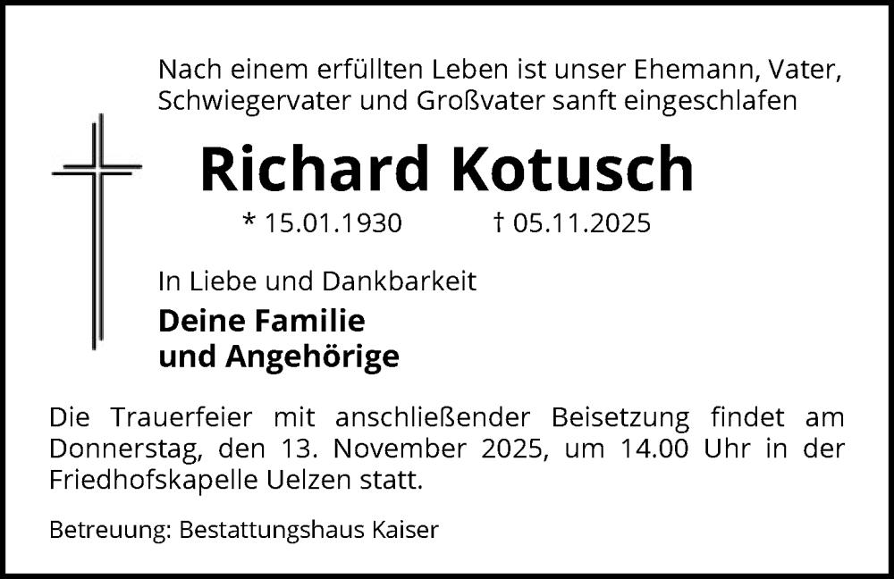 Hier finden Sie alle Traueranzeigen aus der Zeitung, die bisher für Richard Kotusch erschienen sind. Weitere Traueranzeigen, die in der Zeitung erscheinen, werden hier ebenfalls aufgelistet