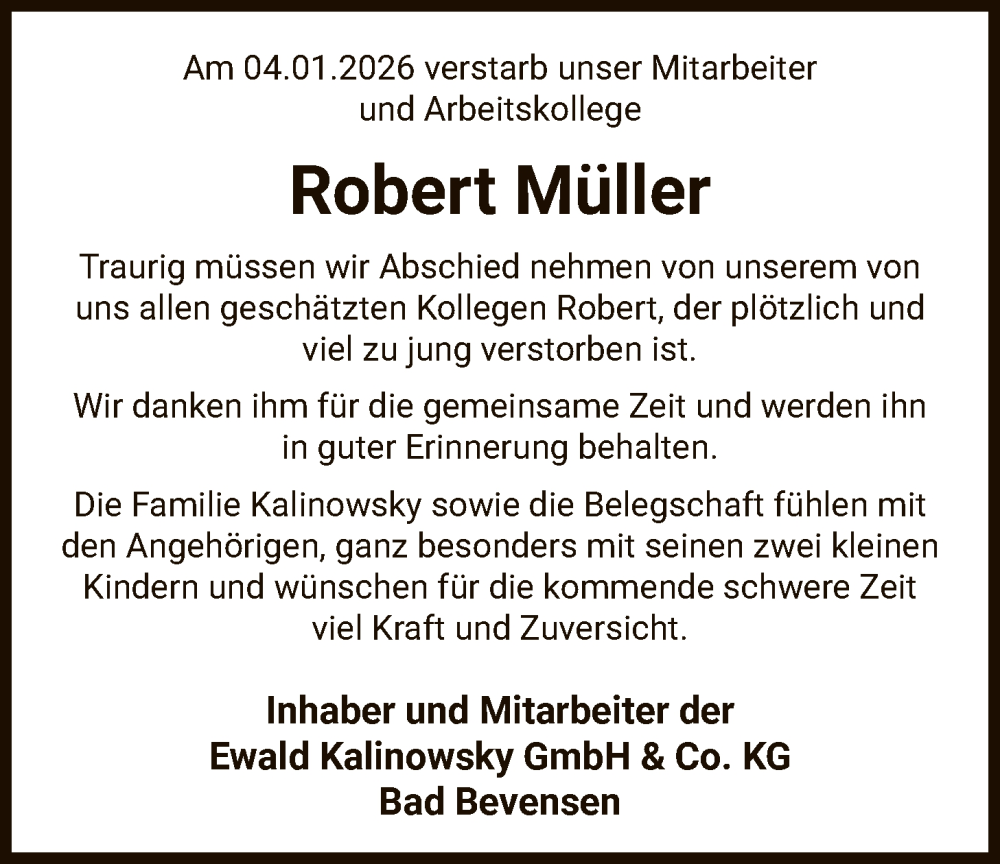 Hier finden Sie alle Traueranzeigen aus der Zeitung, die bisher für Robert Müller erschienen sind. Weitere Traueranzeigen, die in der Zeitung erscheinen, werden hier ebenfalls aufgelistet