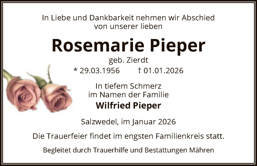 Hier finden Sie alle Traueranzeigen aus der Zeitung, die bisher für Rosemarie Pieper erschienen sind. Weitere Traueranzeigen, die in der Zeitung erscheinen, werden hier ebenfalls aufgelistet
