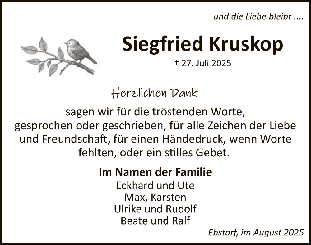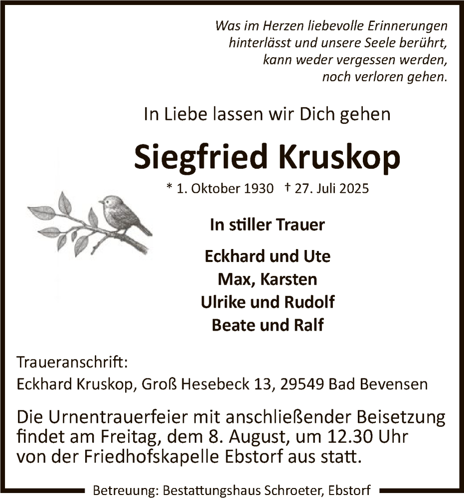 Hier finden Sie alle Traueranzeigen aus der Zeitung, die bisher für Siegfried Kruskop erschienen sind. Weitere Traueranzeigen, die in der Zeitung erscheinen, werden hier ebenfalls aufgelistet