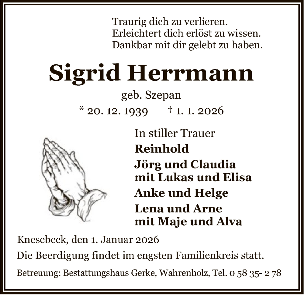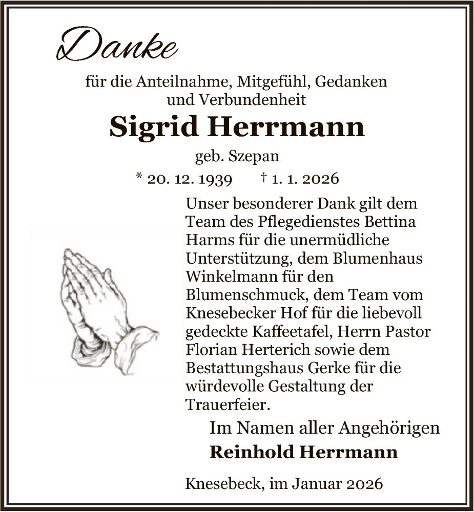 Hier finden Sie alle Traueranzeigen aus der Zeitung, die bisher für Sigrid Herrmann erschienen sind. Weitere Traueranzeigen, die in der Zeitung erscheinen, werden hier ebenfalls aufgelistet