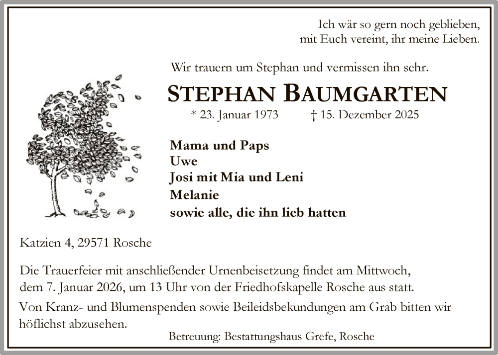 Hier finden Sie alle Traueranzeigen aus der Zeitung, die bisher für Stephan Baumgarten erschienen sind. Weitere Traueranzeigen, die in der Zeitung erscheinen, werden hier ebenfalls aufgelistet