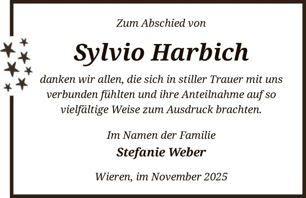 Hier finden Sie alle Traueranzeigen aus der Zeitung, die bisher für Sylvio Harbich erschienen sind. Weitere Traueranzeigen, die in der Zeitung erscheinen, werden hier ebenfalls aufgelistet