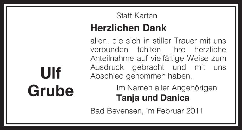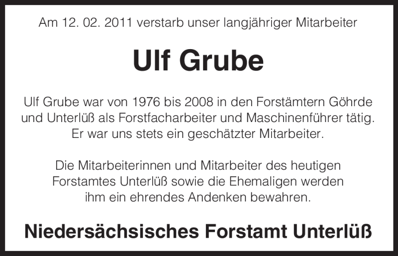 Hier finden Sie alle Traueranzeigen aus der Zeitung, die bisher für Ulf Grube erschienen sind. Weitere Traueranzeigen, die in der Zeitung erscheinen, werden hier ebenfalls aufgelistet