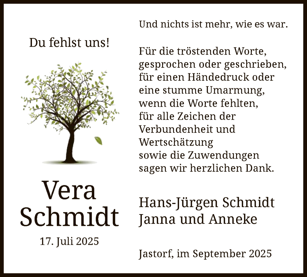 Hier finden Sie alle Traueranzeigen aus der Zeitung, die bisher für Vera Schmidt erschienen sind. Weitere Traueranzeigen, die in der Zeitung erscheinen, werden hier ebenfalls aufgelistet