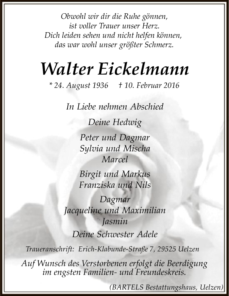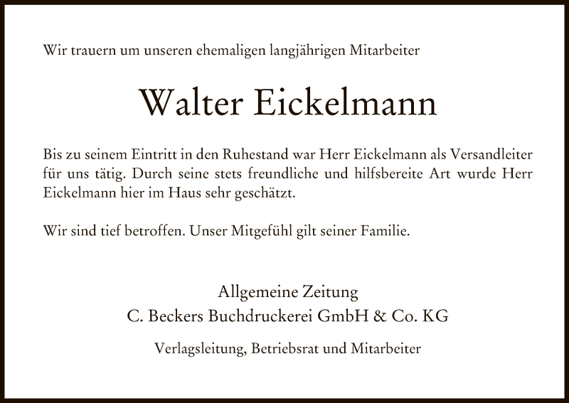 Hier finden Sie alle Traueranzeigen aus der Zeitung, die bisher für Walter Eickelmann erschienen sind. Weitere Traueranzeigen, die in der Zeitung erscheinen, werden hier ebenfalls aufgelistet