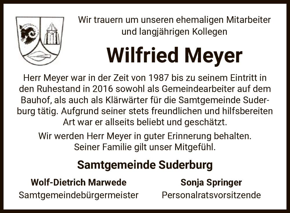 Hier finden Sie alle Traueranzeigen aus der Zeitung, die bisher für Wilfried Meyer erschienen sind. Weitere Traueranzeigen, die in der Zeitung erscheinen, werden hier ebenfalls aufgelistet