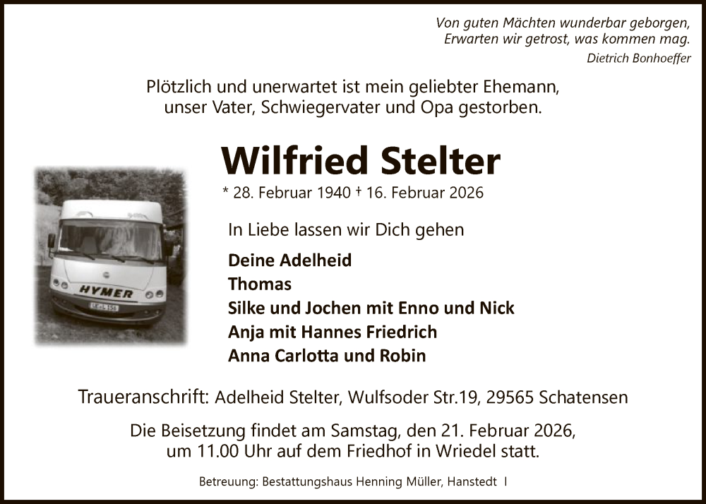 Hier finden Sie alle Traueranzeigen aus der Zeitung, die bisher für Wilfried Stelter erschienen sind. Weitere Traueranzeigen, die in der Zeitung erscheinen, werden hier ebenfalls aufgelistet