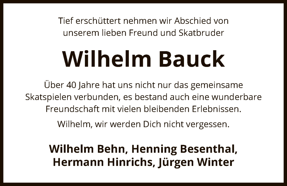 Hier finden Sie alle Traueranzeigen aus der Zeitung, die bisher für Wilhelm Bauck erschienen sind. Weitere Traueranzeigen, die in der Zeitung erscheinen, werden hier ebenfalls aufgelistet