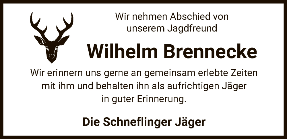 Hier finden Sie alle Traueranzeigen aus der Zeitung, die bisher für Wilhelm Brennecke erschienen sind. Weitere Traueranzeigen, die in der Zeitung erscheinen, werden hier ebenfalls aufgelistet