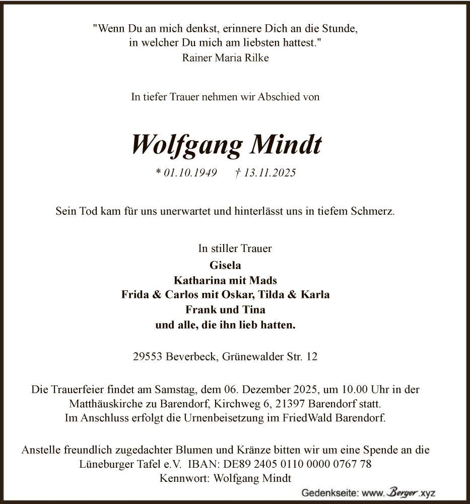 Hier finden Sie alle Traueranzeigen aus der Zeitung, die bisher für Wolfgang Mindt erschienen sind. Weitere Traueranzeigen, die in der Zeitung erscheinen, werden hier ebenfalls aufgelistet